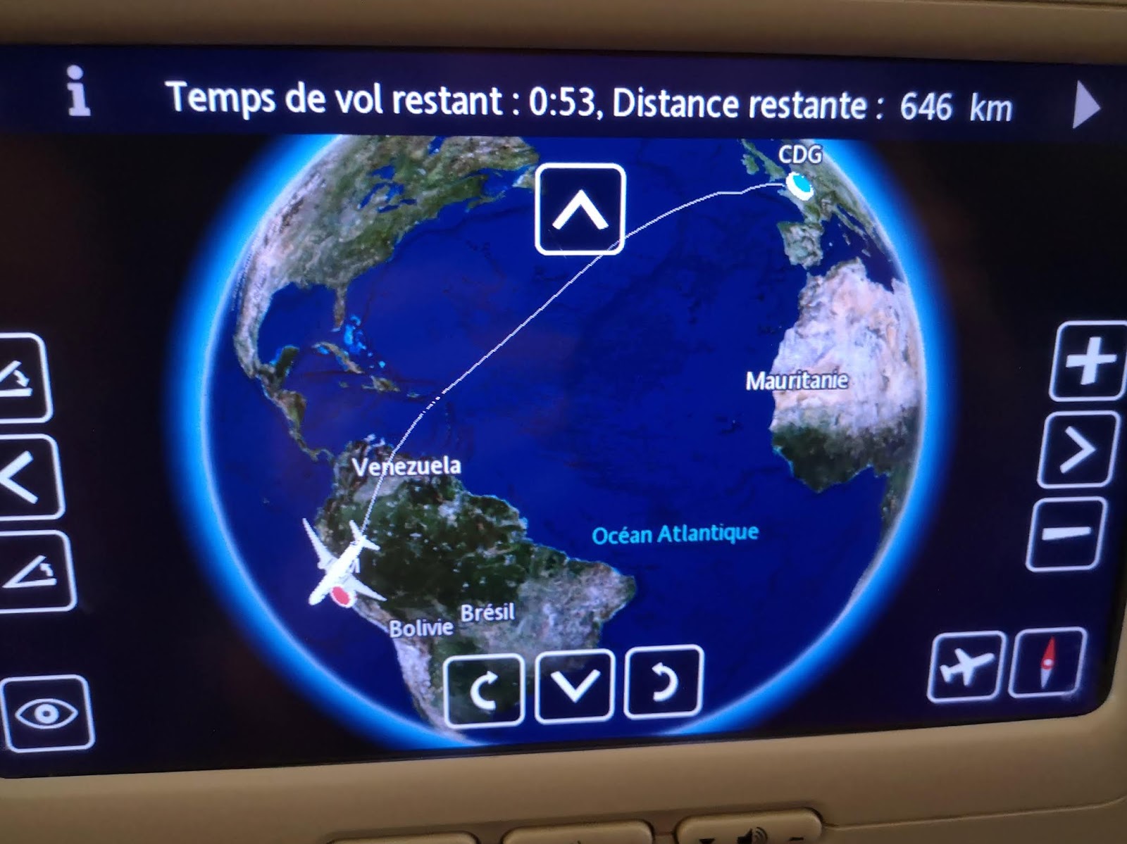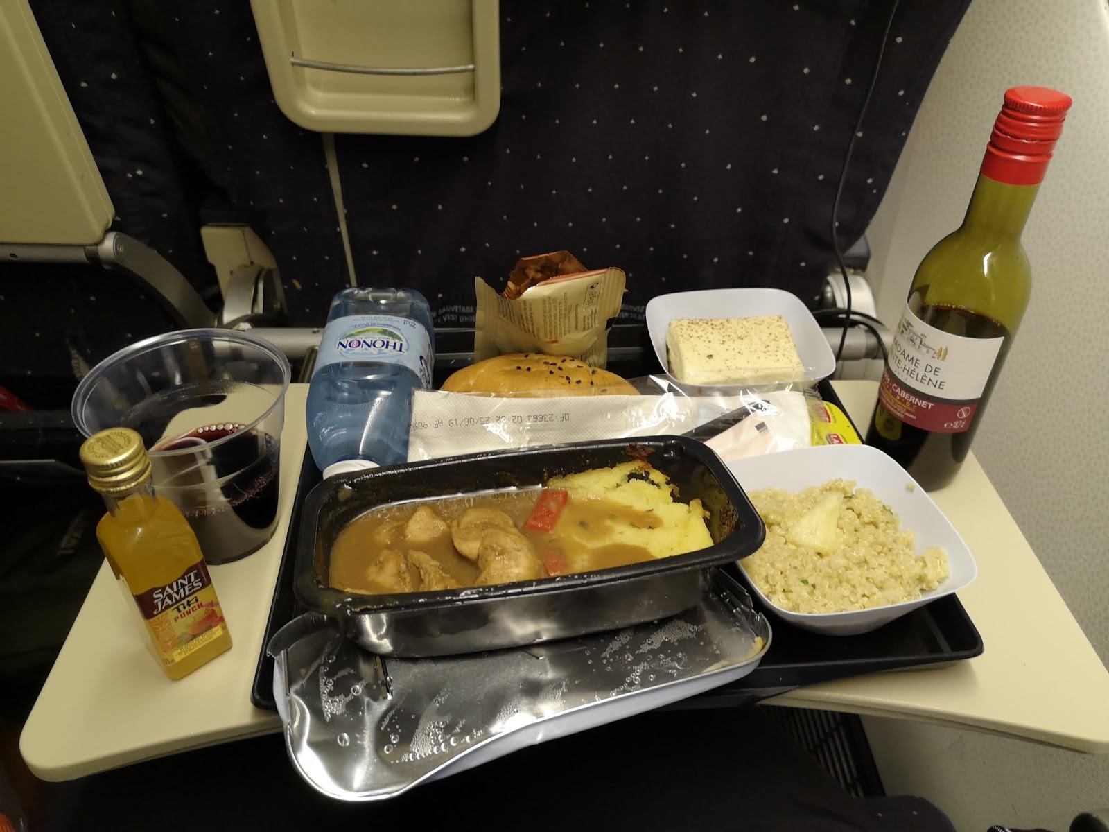 Der Flug verlief trotz des schlechten Sitzplatzes in der Mittelreihe zwischen einem französischen Ehepaar, das die ganze Zeit nur Kreuzworträtsel löste und einem Psychologiestudenten, der ebenso in seine Lektüre vertieft war, unerwartet angenehm. Essen gab es in Hülle und Fülle: Gleich am Anfang ein mehrgängiges Mittagessen (Aperitiv, Huhn mit Gemüsepüree, Taboulé, Camembert mit Butter und Gebäck und ein Stück Kuchen), zwischendurch Eis, Getränke und Süßigkeiten zu freien Entnahme an der Bar, eine Jause in Form von Joghurt und einem süßen Brötchen und kurz vor der Landung noch ein leichtes Abendessen (ein überbackenes Baguette, eine Art Waldorfsalat, Brötchen mit Käse und eine Nachspeise), da war ich aber bereits so satt, dass ich beschloss, alles einzupacken und für das Mittagessen am nächsten Tag in Lima mitzunehmen.