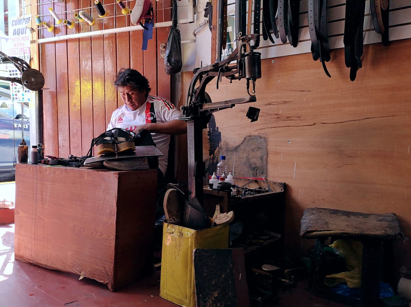 Bei dieser Gelegenheit fragte ich auch, ob ich meinen alten Rucksack nicht irgendwo nähen lassen könnte und landete schließlich bei einem Schuster, der mir das gute Stück innerhalb von 10 Minuten – ich konnte darauf warten – um einen Pappenstiel (5 Soles) reparierte.