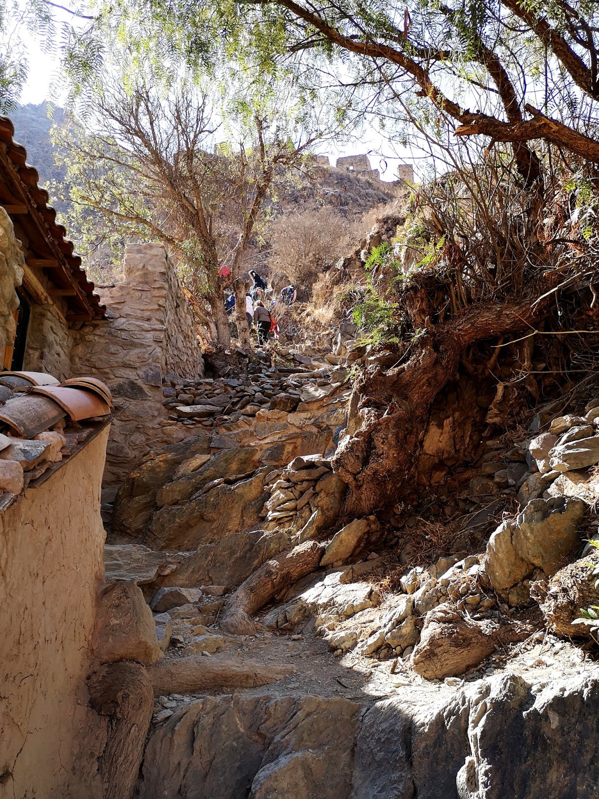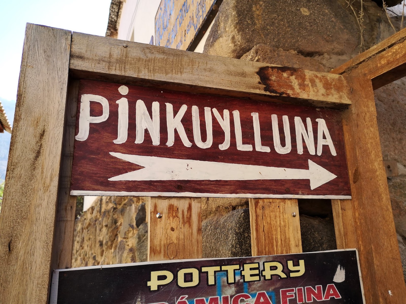 Ein kleines Holzschild in der obersten Straße des Dorfes zeigt an, wo es zum Pinkuylluna geht. Und dann geht es schon los, über hunderte Stufen, die teilweise schon in sehr schlechtem Zustand sind, aus dem Ort hinaus und hinauf auf den Berg.