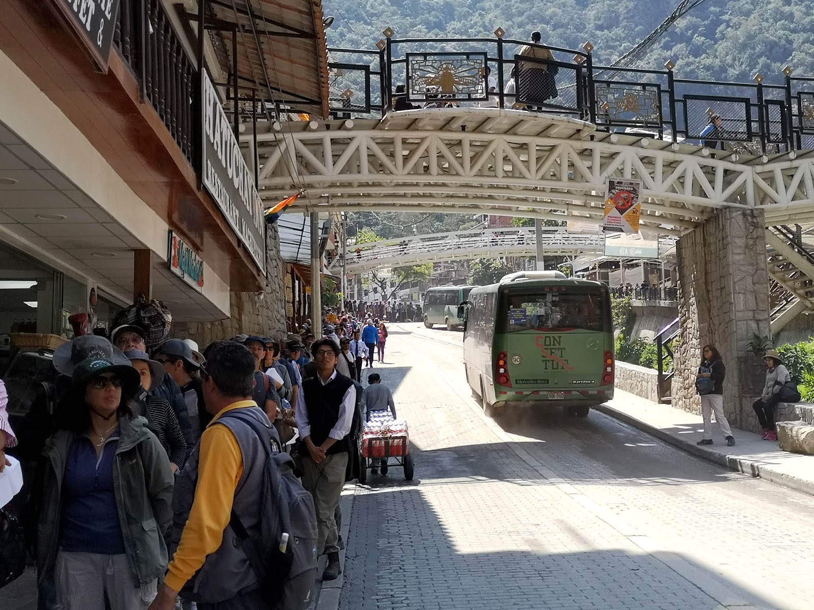 In Aguas Calientes angekommen, muss man einen Shuttlebus bis zum Eingang des Archäologieparks nehmen oder 2 Stunden zu Fuß gehen. Als ich die kilometerlangen Menschenschlangen bei den Haltestellen der Shuttle-Busse sehe, überlege ich nicht lange und beschließe, mich zu Fuß auf den Weg zu machen.