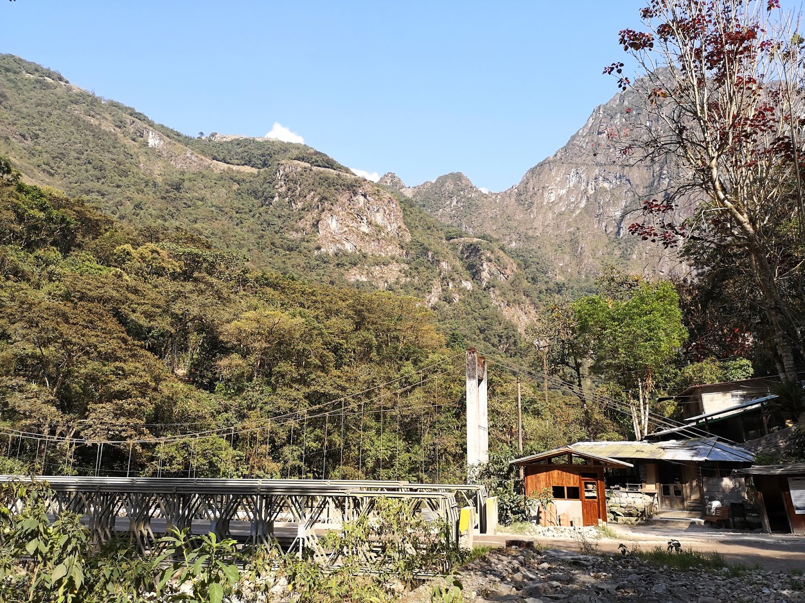 Der Wanderweg entlang der Straße, die auch der Bus nimmt, führt von Aguas Calientes zunächst geradeaus entlang des Flusses bis zu einer Brücke. Dies ist auch der Eingang in den Archäologiepark und man muss sein Ticket und den Reisepass vorweisen. Anschließend geht es noch etwa eine Stunde recht steil bergauf.