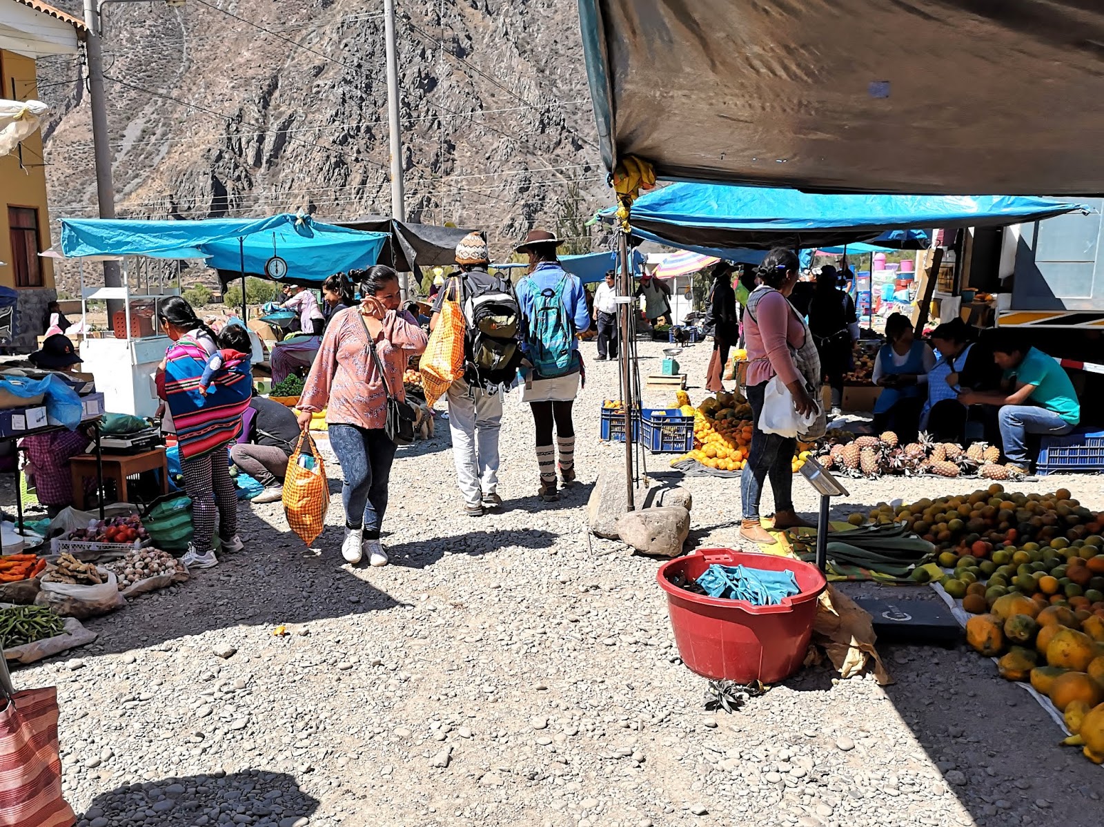 Ich wählte diesmal am Dorfeingang einen etwas anderen Weg und gelangte schon nach wenigen Minuten zum Marktplatz, wo bereits ein reges Treiben herrschte: Vor der Markthalle saßen Bäuerinnen in traditionellen Trachten auf dem Boden. Vor sich hatten sie auf bunten Tüchern ihre Waren ausgebreitet: Obst, Gemüse, frische Kräuter, Gewürze und anderes mehr.